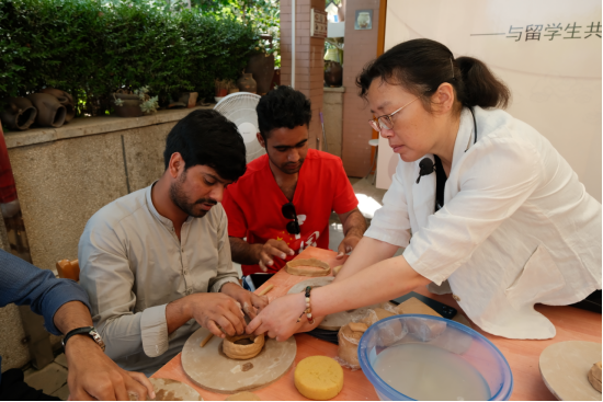 看完特展后,全体同学前往陶艺坊学习中国陶瓷文化,体验制作“陶豆”。特邀嘉宾王克娇老师深入浅出地讲解让同学们初步认识了中国的陶瓷文化,个个跃跃欲试。拉坯、塑型、黏合……同学们在老师的精心指导下,按照自己的理解制作了一个个特殊的“陶豆”。