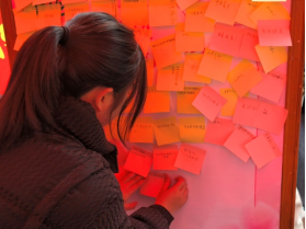 下午一点半,项目团队就开始搭帐篷、摆桌椅、挂横幅、放展板,将活动分为四个区域,分别是签到区、答题区、游戏区、寄语区。活动开始后,同学们排队进行签到便开始参与进游戏当中。答题区有判断题和单选题两类题型,均是与女性性与生殖健康相关的题目,同学们通过答题获得新知识,让女生对自己有了新的认知。游戏区分为“emoji猜成语”和“你划我猜”,同学们在玩游戏的过程中可以充分发挥自己的想象和表达能力。在寄语区,女生和男生们也都写下了对女生的祝福、寄语或者自己的心愿、对未来的期许。为学生发放主题宣传折页,让大家了解女生青春健康知识,让女生学会爱惜、保护自己,让男生学会爱护、尊重女生。活动一直持续到下午五点。