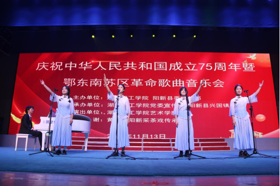 艺术学院羽歌混声合唱团演唱的《小小阳新,万众一心》《向着明天,向着太阳》激昂澎湃、铿锵有力,那豪迈的旋律和坚定的歌声,犹如战鼓雷鸣,拉开了音乐会的序幕。室内管弦乐团表演的《灯火里的中国》,每一个音符都在诉说着无论是小小村落,还是大江大河,我站立的地方皆为祖国!在这片灯火璀璨的土地上,不仅有繁荣的城市,更有那山间绽放的山茶花,一部采茶戏《茶花绽放》,如同璀璨的星辰,既有松柏之骨,又有桃李之姿。群舞《渔光曲》,一把蒲扇,一张方凳,在清晨的弄堂里,描绘属于她们的小家。歌曲串烧《戒赌歌》《旧婚姻不自主》和《鄂东南游击队歌》,鼓舞人们勇往直前,挑战自我。歌曲《五月榴花遍地开》《庆祝成立苏维埃》,用活泼轻快的曲调,唱出对生命的热爱,对阳新县苏维埃成立的喜悦。在黄河边上,有群热血汉子在天地间挥洒着刚毅与坚韧,一支男子群舞《大河之子》,在鼓乐声中披荆斩棘,行出一段路,开出一片天。歌曲《苏俄联合歌》和《喊一声红三军》接踵而至喊出了“军民鱼水情谊深,本是一家人”的口号。一曲《春风十万里》,仿佛将我们带入了一个万物复苏、生机盎然的画卷之中,激励我们继续进发新征程;采茶戏联唱《戏韵芬芳满人间》,带我们走进中国戏曲的文化殿堂,感受戏曲的文化底蕴。一首由古筝与中国鼓相融合的经典民乐《盛世国乐》表演者飞指拨弦弹奏出一幅春江波滟滟、明月共潮生的盛世景象。