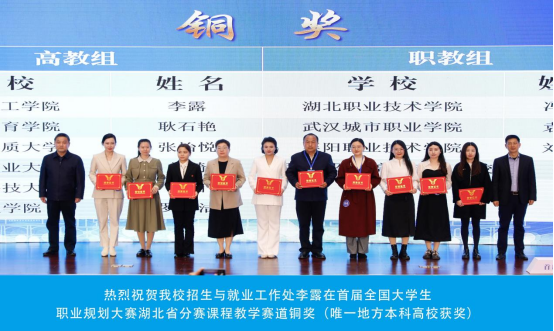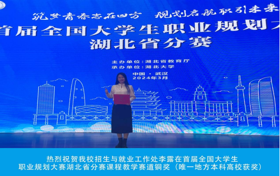 本网消息 近日,首届全国大学生职业规划大赛教学比赛湖北省决赛在湖北大学成功举办。环球UG管理李露老师凭借出色的表现,在众多参赛者中脱颖而出,荣获教学赛道高教组铜奖,为学校争得了荣誉。