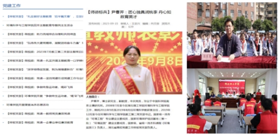 样板示范展现风采,选树典型凝心聚力。支部高度重视样板支部的示范推广作用。一是在学院网站设置“样板支部”专题专栏,通过微视频等方式展现支部风采。二是让专家教授走进企业、社区、乡村和学校,通过积极传播生态文明思想展现支部风采。三是与阳新县地方政府合作,通过宣讲长江流域综合治理与共同缔造展现支部风采。近2年来,支部党员协同非党员师生开展生态环保类、思政教育类等宣讲和培训 30余次。在样板支部培育创建的过程中,涌现出了以支部书记尹春芹同志为代表的典型人物和“校政企人才培养合作共建”的典型案例。仅2023年,支部就有14人次获得“师德标兵、优秀共产党员、优秀教师、科研标兵”等校级及以上荣誉。