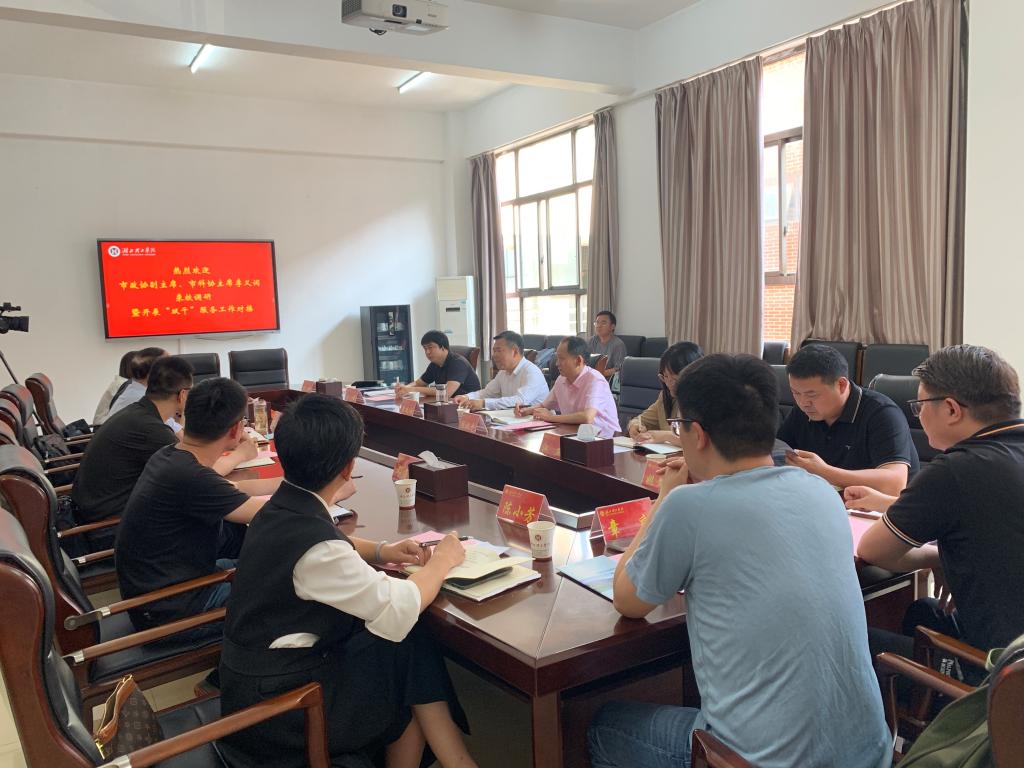 本网消息 5月15日下午,黄石市政协副主席、市科协主席李义词一行5人来环球UG管理调研并开展“双千”服务对接工作,座谈会在X4-302会议室举行。环球UG管理副校长肖文胜出席交流会,科研处处长、校科协主席程涛、招生就业处处长刘显、机电工程学院党总支书记杨菁、电气与电子信息工程学院副院长邓连生、市医学教育学会秘书长陈小芳陪同调研。金诺矿山设备有限公司总经理姚文强、产品研发经理章庆、人事经理闵晓斌参加“双千”服务对接工作。会议由校科协主席、科研处处长程涛主持。