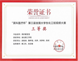 05月28日,由中国化工学会主办、合肥工业大学承办,安徽英科医疗用品有限公司支持的第三届全国大学生化工短视频大赛顺利结束。经过网络及专家初评、全国复评等环节,全国共评选出获奖作品64项,化工学院选送作品“用好暖宝宝”(团队成员:吴智渊、魏伊莲、向梦、刘梦婷、陈钶)荣获全国三等奖。