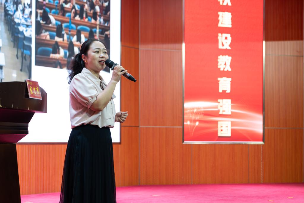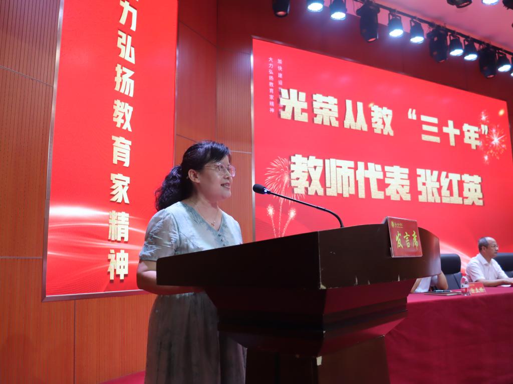 从教三十年之久的张红英老师作为教师代表进行发言。她表示,讲台是教师展示才华的舞台,是传播知识的阵地,教育是人点亮人的艺术,教师要以生为本、立德树人。