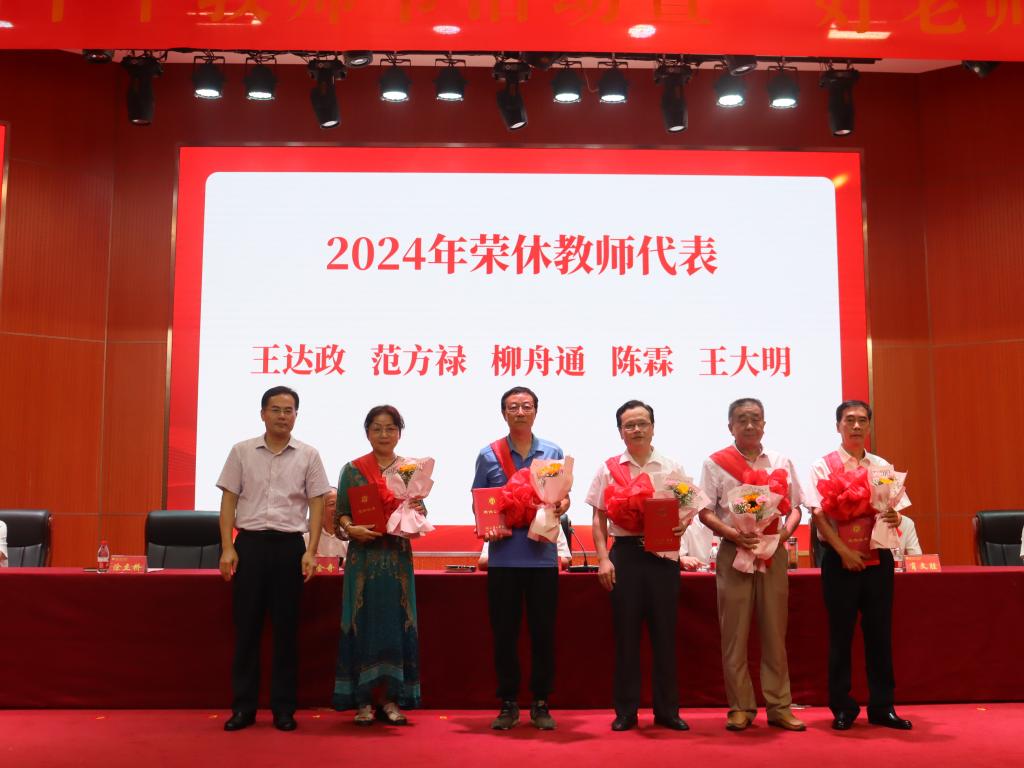 副校长涂立桥为王达政、范方禄、柳舟通、陈霖、王大明五位2024年荣休教师代表颁发证书。