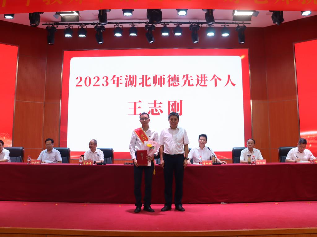 会上,校党委书记张方胜为“湖北师德先进个人”获得者王志刚老师颁奖。