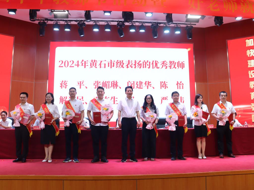 校长李社教为黄石市级优秀教师荣誉获得者蒋平、张嵋琳、闵建华、陈怡、解举民、邓连生、吴涛、严伟颁奖。