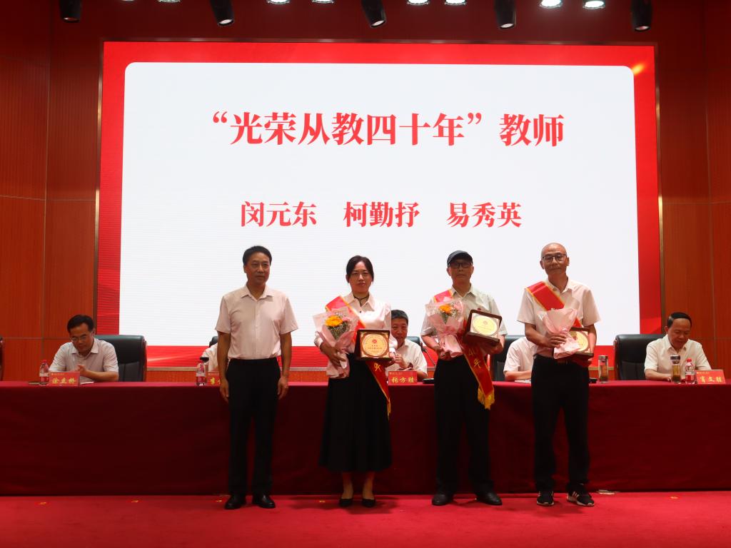 党委常委、纪委书记闵远良为“光荣从教四十年”教师颁发荣誉证书。