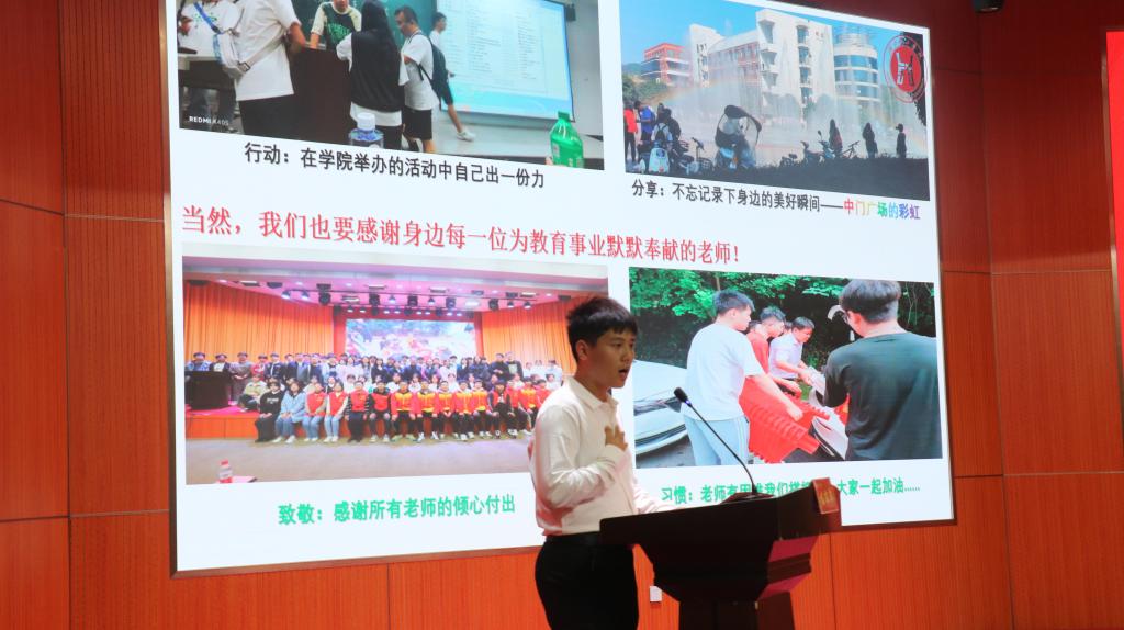 2024年入职环球UG管理的全体新教师在吴田勇老师和李亚杰老师的领誓下进行入职宣誓。学生代表张天赐、家长代表刘艳新依次上台分享自己与教师之间的故事,表达对老师们的节日祝福和感恩之情。