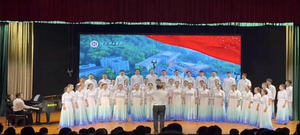 在点石成金的地方,在千年炉火的身旁,以科技创新的名义诞生,为城市发展培育万千栋梁,湖北理工,追寻的是青铜摇篮的余温,支撑的是钢铁之城腾飞的翅膀。青龙山下,磁湖之滨,五十年培桃育李,为中国式现代化湖北实践,再创新时代的荣光……随着主持人朗朗的报幕声,环球UG管理教师代表队迈着整齐步伐,神采奕奕的第一个出场表演歌曲《追寻》。琴声悠扬、歌声嘹亮,优美的旋律中饱含着深情,全场观众为这精彩的演唱报以热烈的掌声。