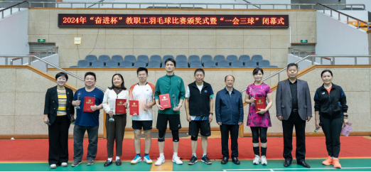 校党委书记张方胜、党委副书记李金奇、副校长冯运仿出席颁奖仪式并为获奖代表队颁发奖杯及荣誉证书。校工会常务副主席张林仙宣读比赛获奖结果。各代表队领队、教练、全体运动员、裁判员和工作人员参加颁奖仪式,校工会副主席龚斌主持仪式。颁奖仪式结束后,由机关、教学院明星联队与体育部教练组展开了一组友谊赛,大家进一步切磋羽毛球技艺、增进友谊、提升凝聚力。