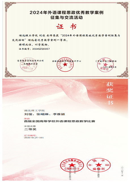 教师的成长与发展显著。在课程思政教学比赛方面,2021年刘俊老师获“高等学校(本科)外语课程思政优秀案例征集与交流活动”湖北省优秀教学案例一等奖,2024年再次获得该项赛事一等奖;2024年9月,陈维维老师在全国高校外语课程思政教学案例大赛中荣获特等奖。