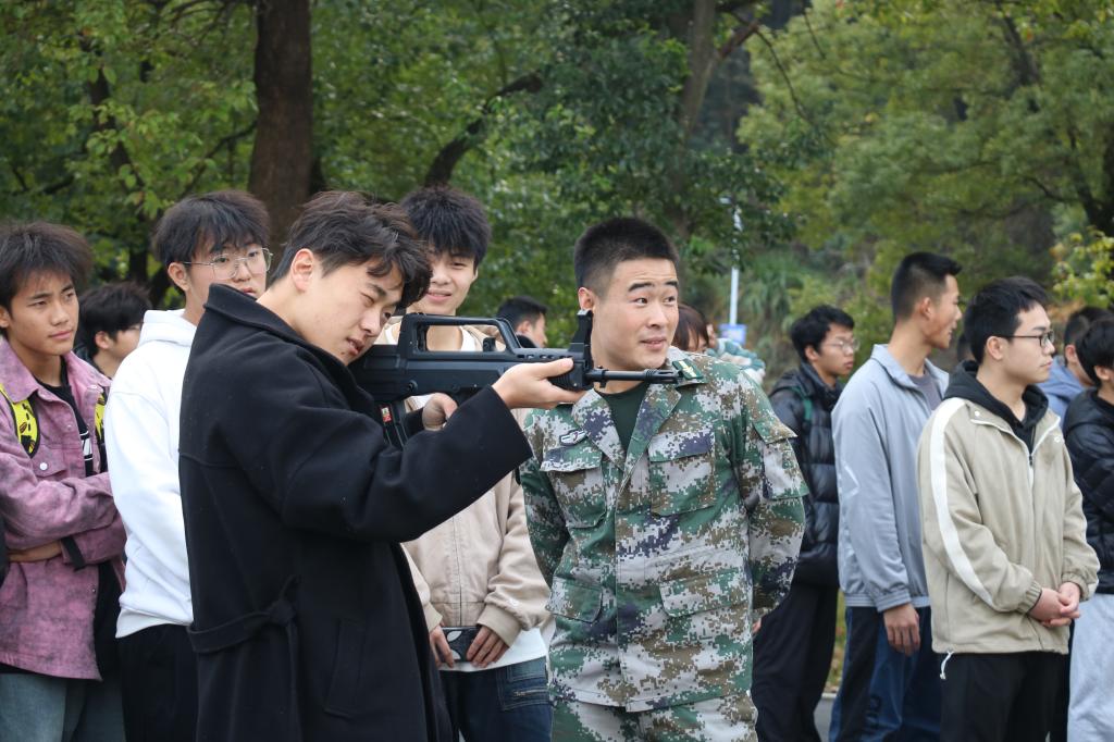 征兵宣讲结束后,继续开展国防教育体验及交流活动。在二楼大厅,讲解员带领学生代表参观军事装备展示,激发参军热情。在豁度楼268会议室,环球UG管理举办“老兵面对面”座谈会。会上,战时一等功臣张金生、见义勇为老兵郭立新、青年榜样闫先锋等5名退伍老兵分享自己的军旅故事,为有参军意愿的同学答疑解惑。东门体育馆外,200余名师生在退役大学生士兵的指导下纷纷参加了模拟射击体验。