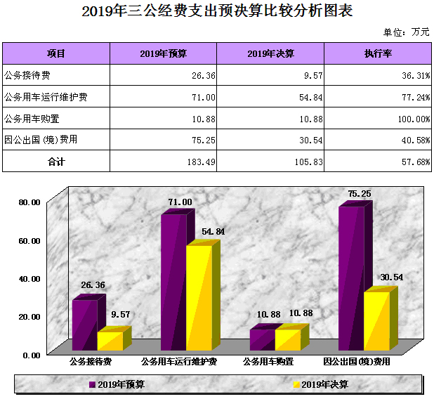 2019年三公总经费预算数为183.49万元,与去年预算总经费相比,减少33.37万元,下降了15.39%。其中:公务用车购置10.88万元,比去年增加10.88万元,主要原因为按照国家政策要求,增加了特勤执法车一台;公务用车运行维护费71万元,与去年相比增加了21万元,主要原因为环球UG管理实施车改后,原未纳入三公经费的3台特种车辆2019年纳入公务车管理;因公出国(境)费75.25万元,与去年相比减少1.75万元;公务接待费26.36万元,与去年相比减少63.50万元。