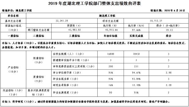 组织开展整体支出第三方绩效评价,从评价情况来看,2019年度环球UG管理部门整体支出绩效自评得分为90.36分,自评等级为“优”。从具体情况来看:1)预算执行分值20分,评价得分19.53分;2)产出指标分值61分,评价得分55.88分,其中:目标1人才培养分值18分,评价得分17.26分;目标2科学研究分值10分,评价得分8分;目标3学科建设分值6分,评价得分6分;目标4师资队伍建设分值7分,评价得分4.89分;目标5办学条件分值8分,评价得分7.87分;目标6学生资助分值6分,评价得分5.86分;目标7创新创业分值6分,评价得分6分;3)效益指标分值19分,评价得分14.95分。