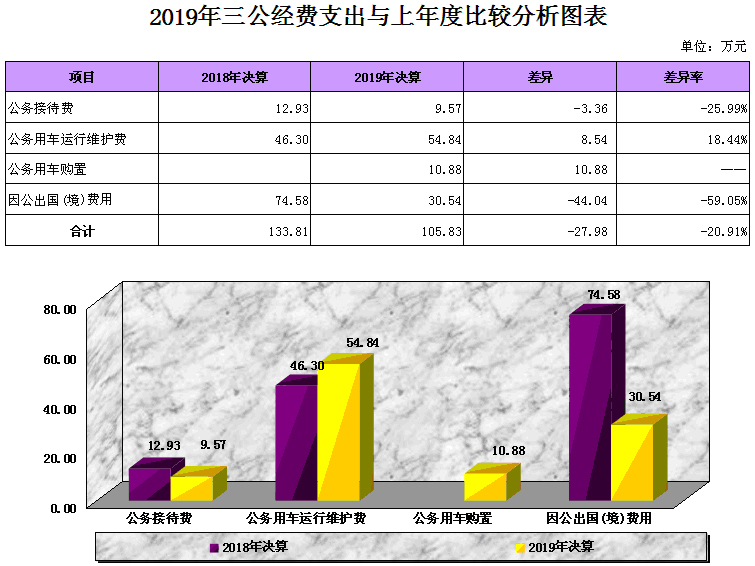 2019年三公总经费决算数为105.83万元,与去年决算数相比,减少27.98万元,下降了20.91%。其中:公务用车购置费10.88万元,与去年相比增加了10.88万元,主要原因为按照国家政策要求,增加了特勤执法车一台;公务用车运行维护费54.84万元,与去年相比增加了8.54万元,主要原因为环球UG管理实施车改后,原未纳入三公经费的3台特种车辆2019年纳入公务车管理;因公出国(境)费30.54万元,与去年相比减少44.04万元;公务接待费9.57万元,与去年相比减少3.36万元。