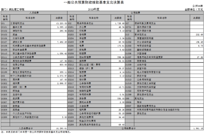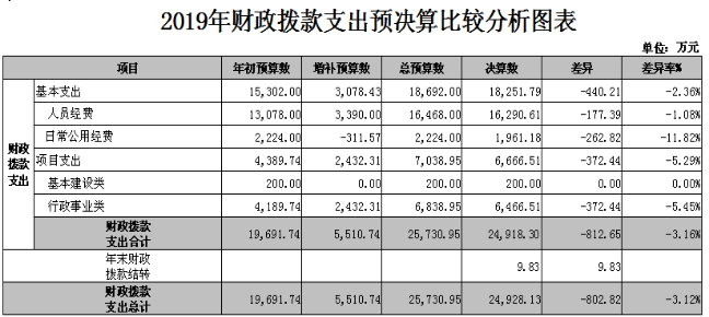 2、2019年财政拨款支出的决算数比总预算数减少812.65万元,差异率为-3.16%。主要原因分析:(1)基本支出与总预算相比下降了440.21万元,主要是因资产收益预算未完全实现,未形成支出。(2)项目经费支出与预算相比下降了372.44万元,主要是基建项目社会审计未完成,年底未支付工程尾款,故未形成支出。