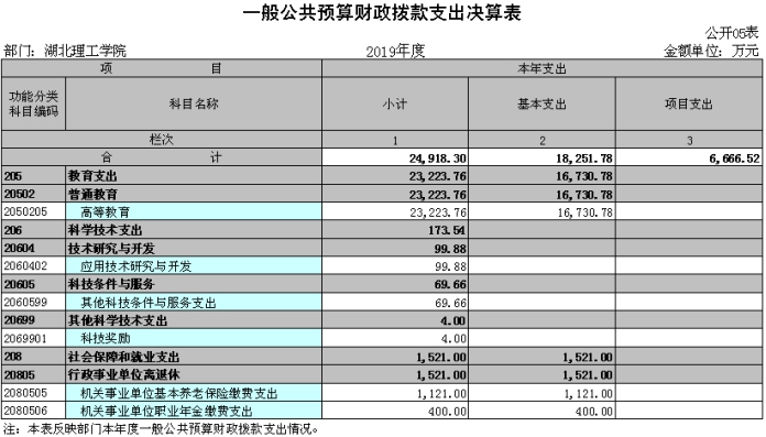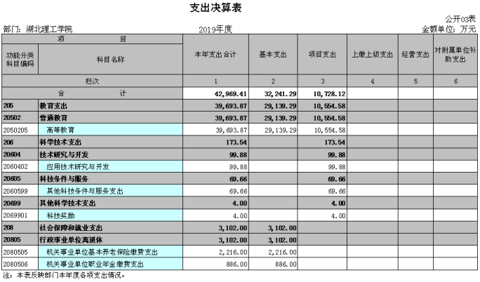 2019年部门决算总支出42,969.41万元。与2018年相比增加了7,591.01万元,增长21.46%。其中:(1)基本支出增加5,174.23万元,主要原因是兑现2018年-2019年职工政策性增资及补发了2014-2017年职工工资,且学生公寓住宿管理物业费有所增加。(2)项目支出增加2,416.78万元,主要原因是高校科研课题项目经费支出、中央支持地方高校改革发展专项支出及高校基本建设支出增加。