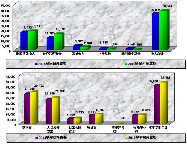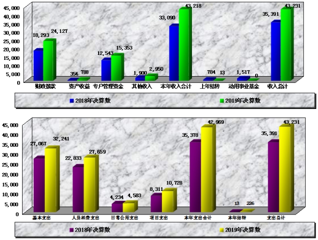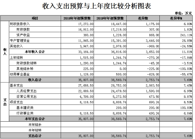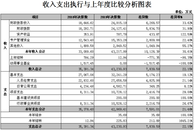 因2019年预决算编报政策和体系变化,编报口径要求与2018年不同,2018年非税收入列入一般公共预算财政拨款,而2019年单独列为专户管理事业收入,故只能按总体情况全口径对比。