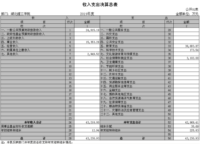 2019年度总收入43,230.93万元,其中公共预算财政拨款(补助)24,915.19万元,占总收入的57.63%;专户管理教育事业收入15,353.28万元,占总收入的35.51%; 其他收入2,949.52万元,占总收入的6.82%,上年结转12.94万元,占总收入的0.04%。公共预算财政拨款(补助)中经费拨款(补助)24,127.41万元,行政事业单位国有资产收益拨款787.78万元。