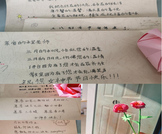 在这个特殊的日子里,为活跃校园内的节日氛围,表达对女性的尊重与支持,土建学子们纷纷行动起来,大家一起写祝福语、折千纸鹤、爱心等来表达对同学、老师和家人们的美好祝福。各班班长同班主任老师献上了手写贺卡和手工玫瑰,感谢班主任老师一直以来的关爱和付出。
