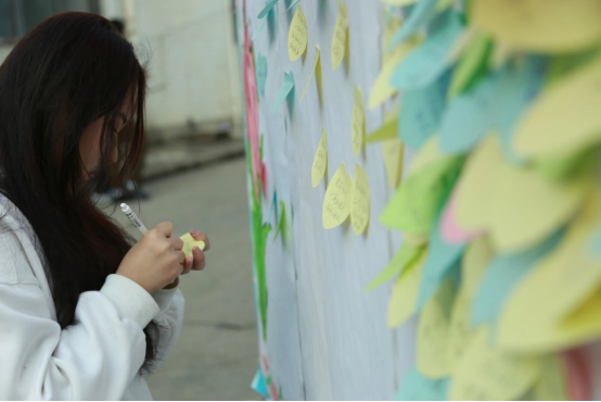 活动主要以心愿墙、螃蟹夹球、师生联欢等形式开展。活动伊始,同学们踊跃报名,领取心愿便利贴,认真地写下祝愿,小心翼翼地贴在心愿墙上,老师们为写下祝愿的同学送上一束鲜花。来到趣味活动环节,现场气氛热烈,欢声笑语不断。