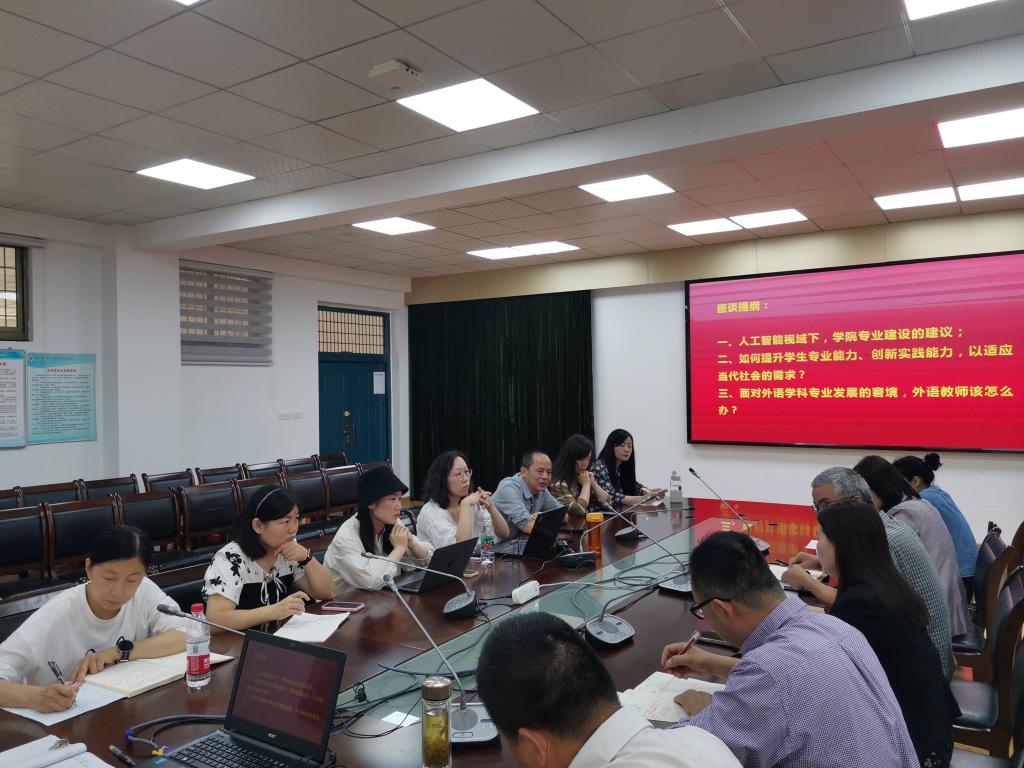 座谈会上,大家围绕“人工智能视域下对学院专业建设的建议”、“如何提升学生专业能力、创新实践能力以适应当代社会的需求”、“面对外语学科专业发展的窘境,外语教师该怎么办?”进行了深入探讨和交流,大家畅所欲言、各抒己见,从不同角度对学院学科专业建设、人才培养及教师能力提升等方面提出了很多中肯的意见和建议。大家认为,当前外语学科专业要与人工智能、校内优势学科充分交叉融合,拓宽专业发展路径;教师要积极主动学习、研究跨学科特别是人工智能方面知识,以适应新时代外语专业教育教学的发展大势;教师在课程教学、实习实践、项目申报以及指导学生社团活动中,要更新教育教学理念,改进教育教学方法,通过项目式教学引导学生锻炼和提升适应社会需求的综合能力。