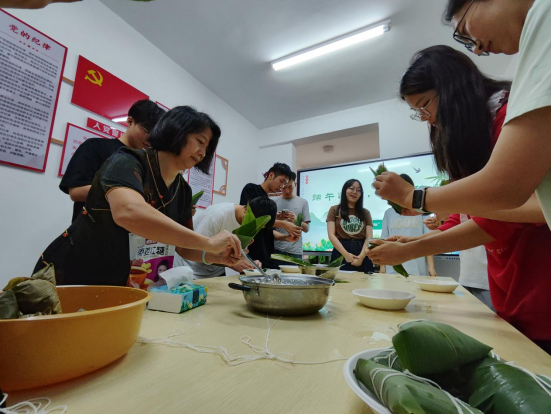 在包粽子环节,老师同学齐上阵,纷纷拿起粽叶学习体验包粽子。折粽叶、填糯米、加红糖、包裹成形,再用细绳扎紧。有的同学是第一次包粽子,虽然手法生疏,但兴奋和认真的劲头丝毫不减,有的同学相互协作,共同完成人生中第一个粽子。少数民族学生格桑旺姆表示:“活动是一次很新鲜的体验,不仅学习了端午节的文化,更感受到计算机学院的温馨。”青青的粽叶,饱满的糯米,一个个粽子承载了计算机学院大家庭的浓浓温情。