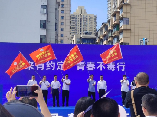 在启动仪式上,志愿者代表陈三老师与我市其他高校代表一同上台,完成禁毒志愿者授旗仪式。省禁毒委副主任、省公安厅副厅长杨彪,团省委副书记蔡伟伟在致辞中表示,各高校广大青年学子要戮力同心、担当作为、施展才干,为筑牢禁毒防线、护航无毒校园贡献青春力量。