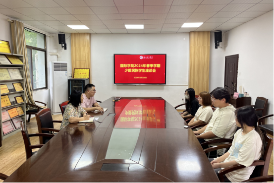 本网消息 6月19日上午,国际学院在教Ⅰ楼401会议室举行少数民族学生座谈会,深入推进铸牢中华民族共同体意识,促进学院民族工作高质量发展,加强民族团结教育。会议由党总支部副书记刘红云主持,学生党支部书记黄亚和少数民族学生代表参加。
