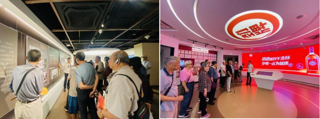 随后,大家来到黄石大冶劲牌总部沉浸式感受黄石建设新成果。“劲酒虽好,可不要贪杯哟”是大家耳熟能详的广告语,它背后的劲牌公司是一家于1953年创立于湖北大冶的健康产品企业,现已发展成为覆盖20多个国家和地区的公司。在讲解员的带领下,大家参观了劲牌健康产业园、陶坛酒库和劲牌文化展馆;在劲牌公司展览厅中,大家领略到劲酒的产品发展历程,一件件推陈出新的产品彰显着劲牌公司对科技创新创造品质好酒的不懈追求。老同志们一路走、一路看,一路议、一路赞。每到一处,大家都驻足细心观看,详细了解,亲身感受近年来劲牌公司高质量发展成果。同时作为黄石市经济社会发展的见证者、建设者和受益者,大家为家乡企业取得的高质量发展成就深感骄傲和自豪。