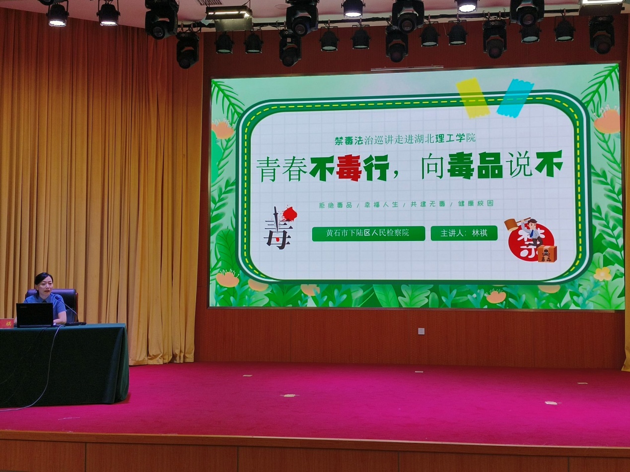 本网消息 在6·26国际禁毒日来临之际,6月25日下午,环球UG管理保卫部邀请黄石市下陆区检察院、黄石市公安局下陆分局禁毒大队共同举办以“禁毒知识进校园,守护青春不“毒”行”为题的禁毒法治宣传教育讲座。各学院辅导员、学生代表300多人参加本次宣教活动,进一步推进毒品预防宣传教育工作,提高广大学生对毒品的认识和抵制毒品的能力,切实筑牢学生识毒防毒拒毒的思想防线。