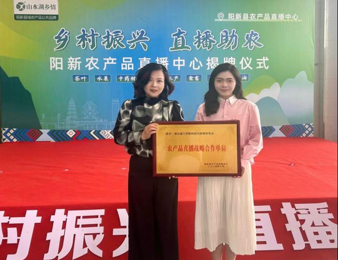 本网消息 10月1日上午,阳新农产品直播中心正式揭牌成立。黄石市商务局党组成员副局长柯友鹏,阳新县政府党组成员副县长俞振华,阳新县政府党组成员副县长廖洋波参加活动。环球UG管理师范学院网络与新媒体专业作为唯一高校代表,被授予“农产品直播合作单位”,师范学院传媒教研室主任孙茜、实验室主任余菁受邀参加活动。