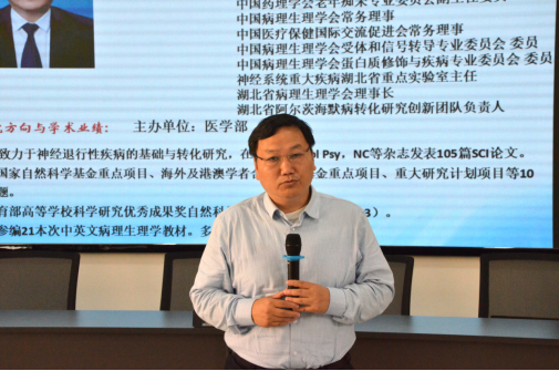 王小川教授从阿尔茨海默病的发病机制、如何延缓疾病等方面深入浅出地进行了阐述。老年痴呆症(亦称阿尔茨海默病,AD)是最常见的神经退行性疾病,随着社会人口的老龄化,AD患病人数急剧上升,严重危害人类健康,降低患者生活质量。王小川教授讲解了tau蛋白病变(Tauopathy)在神经变性性疾病中的作用,指出PP2A是tau的主要磷酸酶,增强PP2A的活性将对阿兹海默的治疗有很好的效果。他介绍了自己在PP2A活性缺失影响Tau蛋白磷酸化修饰及其下游事件参与神经原纤维退变机制、AD模型构建、针对AD发病关键分子开展药物筛选的研究成果,开阔了大家的视野,使师生们受益匪浅,获益良多。