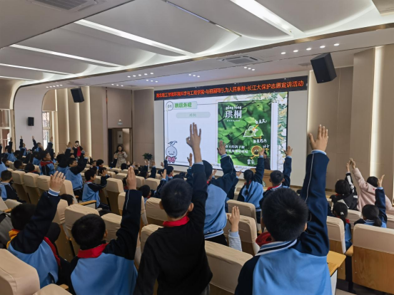 黄金山实验小学的校园里充满了浓厚的环保氛围。绿色天使志愿服务大队的志愿者们身着统一的志愿马甲,带着精心准备的环保知识宣讲课件,走进了孩子们的课堂。他们通过生动的讲解、有趣的互动和有奖问答,向孩子们传递了志愿服务的重要性和长江保护的相关知识。志愿者们用浅显易懂的语言和生动的案例,让孩子们深刻认识到保护环境的重要性,激发了他们对环保事业的热爱和关注,也为孩子们埋下了争当志愿者的种子。