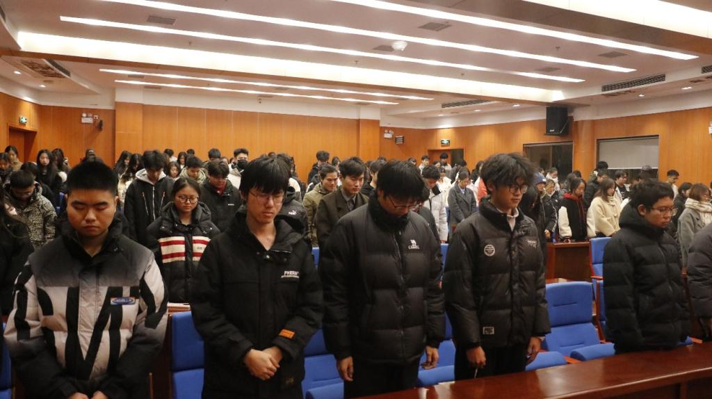“请全体起立,为在南京大屠杀中遇难的30余万名同胞默哀一分钟,致以沉痛哀悼……”活动开始,全体同学低头默哀,表达对逝者的深切哀悼。