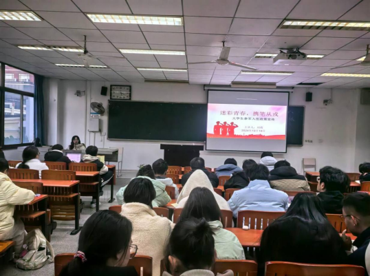 辅导员刘霞开展“迷彩青春、携笔从戎”为主题的征兵宣传讲座。在活动现场,刘霞现场发放征兵宣传手册,详细介绍今年征兵的政策法规、征集对象、征集流程以及优待政策等。