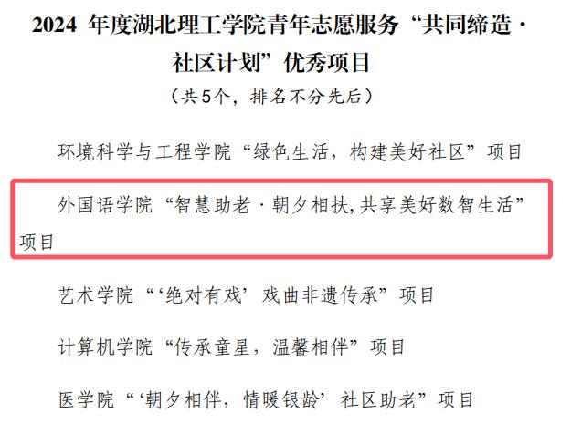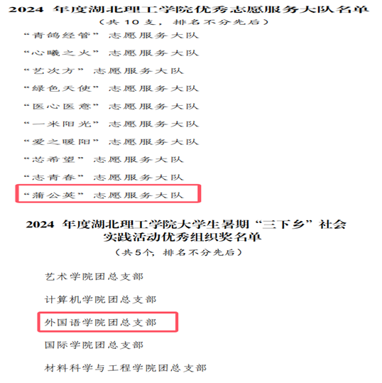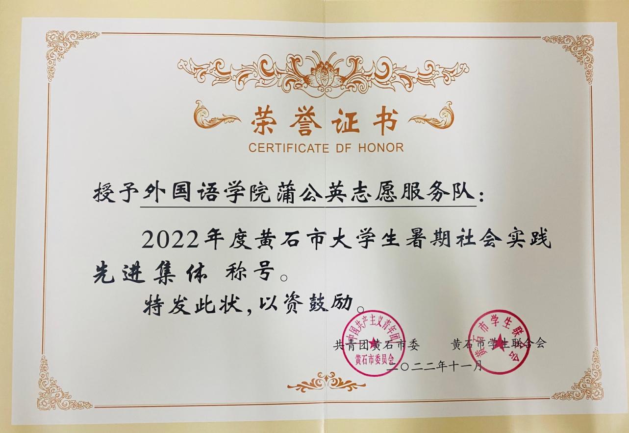 蒲公英志愿服务队获得多项荣誉:2022年11月荣获黄石市大学生暑期社会实践“先进集体”称号、2023至2024年连续两年荣获环球UG管理“优秀志愿服务大队”,外国语学院荣获2024年度环球UG管理大学生暑期“三下乡”社会实践活动“优秀组织奖”,学院“智慧助老•朝夕相扶,共享美好数智生活”项目荣获“共同缔造·社区计划”优秀项目。