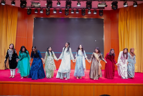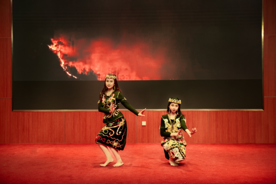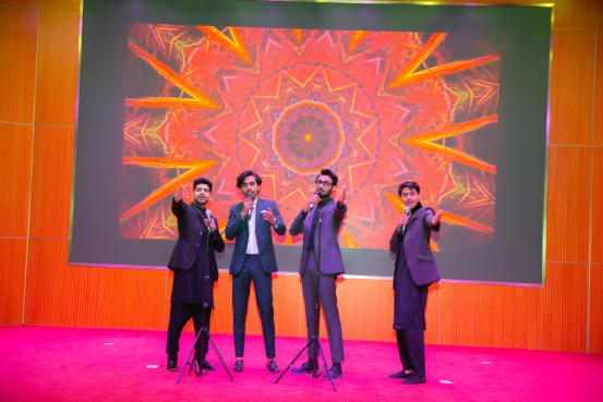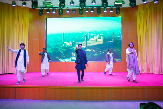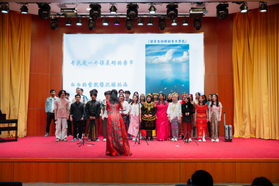 迎新晚会由2024级汉语进修生雨希、陈嘉兴主持。辅导员程紫雨老师的一首《龙船调》拉开了晚会的序幕,随后来自巴基斯坦、印度尼西亚的同学们带来了舞蹈《Punjabi Dance》《Flying High》和歌曲《A Million Dreams》《Eaaa》《One Only》《Kun Faya Kun》和情景剧《跨越山海情难忘,勿畏前行携手望》。晚会的互动环节也十分精彩,对外汉语教研室主任缪杉莎巧妙设计了关于中国年俗文化的抢答题,吸引了留学生积极参与。整场晚会,现场气氛热烈,欢呼声、掌声此起彼伏。晚会在全体演员和观众共同演唱的校歌中圆满落幕。