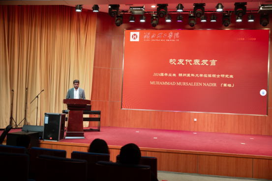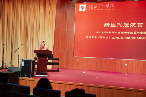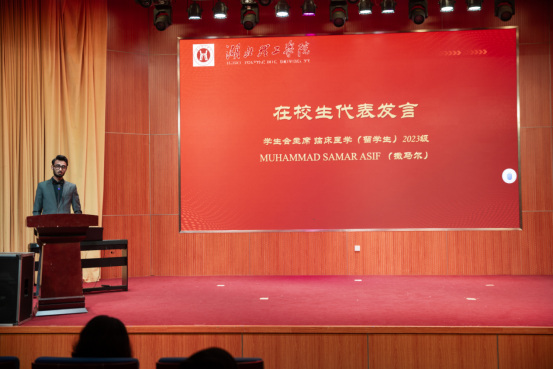 新生代表2024-2025学年湖北省国际学生奖学金获得者,来自巴基斯坦的2024级临床医学专业留学生Siddique Misbah发言,她表达了对湖北省政府、学校、老师的感激之情,承诺一定不负湖北省政府、学校和老师的期望,做好学业规划,努力学习专业知识、汉语和中国文化,做中国和巴基斯坦友谊的使者。在校生代表学生会主席2023级临床医学留学生 Muhammad Samar Asif介绍了在环球UG管理学习期间取得的成绩、学生会工作计划以及对全体留学生的希望。校友代表锦州医科大学硕士研究生,2024届毕业生MuhammadMursaleen Nadir分享了他在环球UG管理学习的经历,对学校领导、老师的关心、教导、支持表示感谢,鼓励学弟学妹努力成为优秀的医学人才。