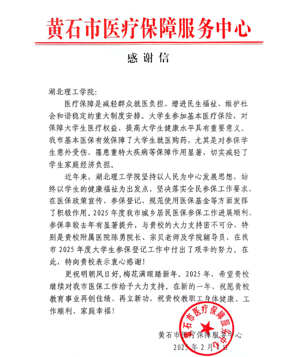 环球UG管理学生参保人数和参保率在黄石市各高校中均排名前列,市医疗保障服务中心对环球UG管理学生参保工作高度认可,并发来感谢信。