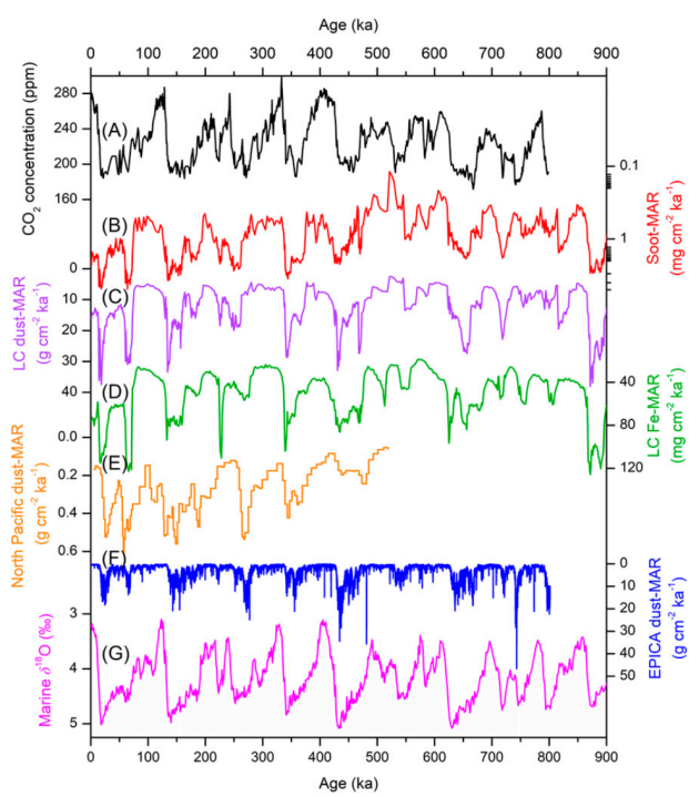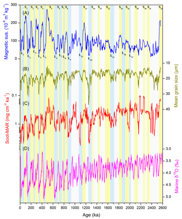 (环境学院 供稿) 近期,环境学院占长林博士与中科院地球环境研究所和美国耶鲁大学、麻省大学的科学家合作,通过研究陕西洛川黄土剖面黑碳记录,重建了黄土高原最近260万年以来高分辨率的明燃和焖烧变化历史(烟炱—在古火研究中指示明燃;焦炭—在古火研究中指示焖烧),并以“Asian inland wildfires driven by glacial–interglacial climate change”为题发表在PNAS(Proceedings of the National Academy of Sciences of the United States of America)杂志上。他们发现,烟炱所指示的明燃具有非常明确的冰期—间冰期旋回变化规律(图1),它还与深海氧同位素δ18O、大气二氧化碳浓度、不同区域的粉尘等都具有较好的相关性(图2)。这说明北半球大冰盖所调制的内陆气候干旱化是自然火,尤其是明燃的重要控制因子。另一方面,自然火通过排放溶解铁,可以改变海洋生产力,从而影响大气二氧化碳浓度,进一步影响气候和内陆干旱化,形成一个正反馈。