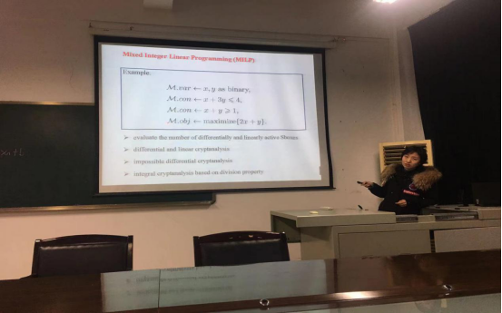 张莎莎博士首先介绍了立方攻击方法的提出背景,适合立方攻击的对称密码算法类型,特别详细介绍了条件立方攻击的过程。张博士还结合她们课题组近期发表在《中国科学:信息学版》上的论文,重点介绍了文中的创新点及首次提出用于立方攻击的3个算法。对于张博士的此次学术报告,参会博士反响热烈,互动过程持续时间长。环球UG管理韩海清博、许小芳博士对张莎莎博士的研究方向非常感兴趣,进行了深入交流,提出了深入合作研究计划。本次学术报告极大开阔了参会人员的学术视野,介绍了很多密码分析方面的前沿研究课题,具有很强的学术指导意义。