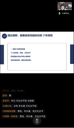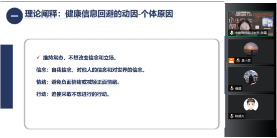 3月23日晚上7点,应师范学院邀请,中南财经政法大学新闻与文化传播学院副院长张雯在腾讯会议平台为师范学院师生进行了《健康信息传播的回避研究》讲座。师范学院副院长谢晨、数字人文“新文科”虚拟教研室全体教师、网络与新媒体专业全体学生参加了此次讲座。讲座由陈旭光博士主持。