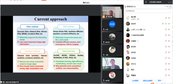钟秋祥博士报告主题为《图像处理问题中的两类曲率正则化方法及其应用》,针对图像复原方法非光滑、非线性和计算复杂度高、无法保留图像重要几何特征等缺陷,基于微分几何理论,把二维图像映射为三维欧式空间中的曲面,设计了图像表面上不同曲率的估计算法,建立了全新的曲率正则化模型和有效的数值求解算法,应用于图像去噪、修复、分割等各项底层图像处理任务。