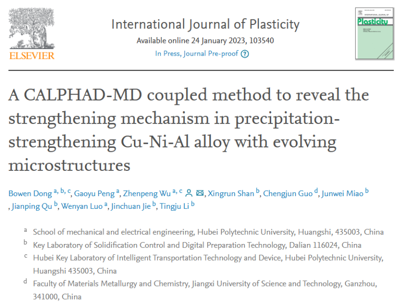 机电工程学院“先进摩擦材料制备与仿真团队”最新研究成果“A CALPHAD-MD coupled method to reveal the strengthening mechanism in precipitation-strengthening Cu-Ni-Al alloy with evolving microstructures”发表于《International Journal of Plasticity》期刊。环球UG管理为该论文第一署名单位,第一作者为董博闻博士,通讯作者为吴振鹏博士。