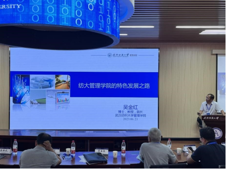 管理学科高质量发展研讨会开幕式由武汉纺织大学管理学院院长吴金红主持。随后,分为高校专场和企业专场进行讨论。高校专场由管理学院副院长张飞主持,企业专场则由湖北兴华教投信息技术有限公司总经理田志鹏主持。武纺大副校长冯军与武纺大管理学院院长吴金红教授先后就武汉纺织大学在学科建设方面取得的成绩以及武纺大管理学院的特色发展之路进行了展示与讲解。