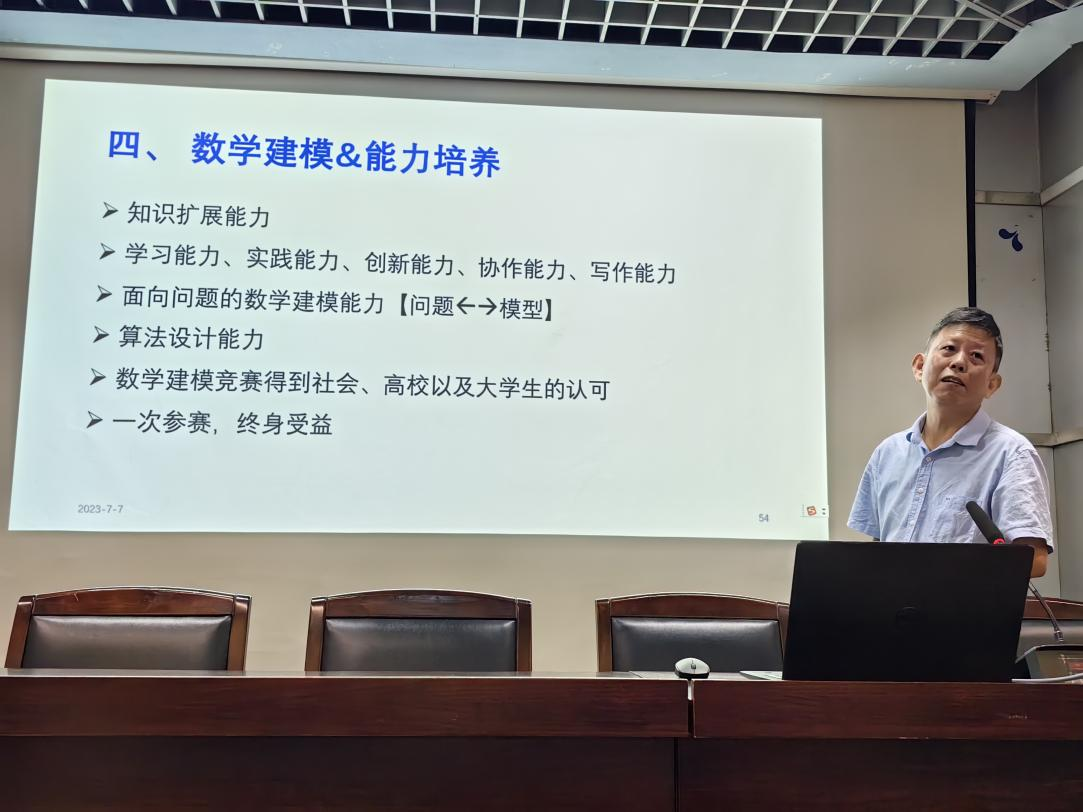 本网消息 7月7日上午,数理学院在T2报告厅举办“数学建模与学生综合能力培养”主题讲座。武汉大学博士生导师兼全国大学生数学建模竞赛湖北赛区专家组组长羿旭明教授受邀担任本次主讲嘉宾。讲座由数理学院副院长许小芳主持,数学建模暑期培训的全校80余名优秀学子聆听讲座。在讲座中,羿教授与大家分享如何开展数学建模培训,以及在培训过程中如何培养建模的能力。