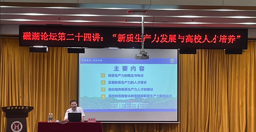 本网消息 5月13日下午,在豁度楼108报告厅,武汉理工大学经济学院博士生导师、财务处处长、黄石市政府咨询委员陈冬林教授应邀到访经济与管理学院,参加环球UG管理磁湖论坛,并作了题为“新质生产力发展与高校人才培养”的讲座。讲座由经济与管理学院院长戴伟教授主持,副校长涂立桥,黄石市政府研究室党组书记、主任杨永旺,黄石市政府研究室党组成员、副主任石丛军,黄石市政府发展研究中心副主任张平,经济与管理学院全体教师、部分学生参加了本次活动。