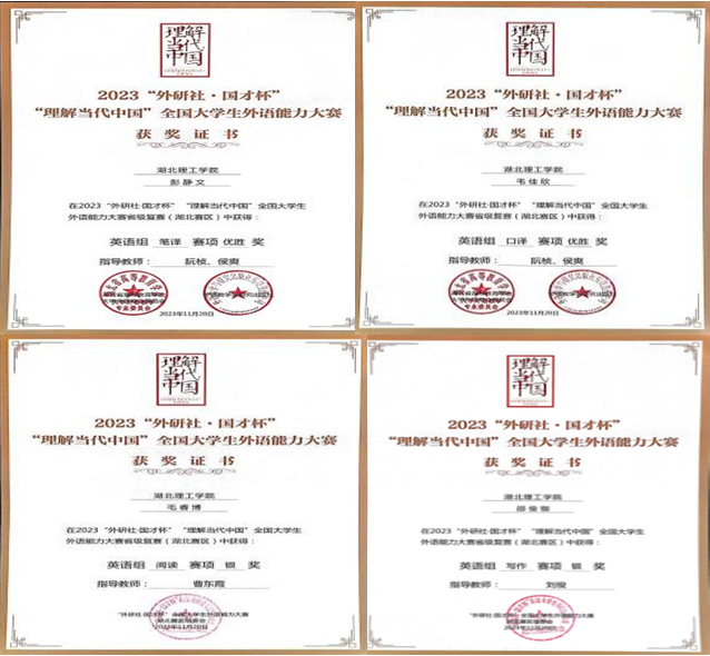 教师的成长与发展显著。在课程思政教学比赛方面,2021年刘俊老师获“高等学校(本科)外语课程思政优秀案例征集与交流活动”湖北省优秀教学案例一等奖,2024年再次获得该项赛事一等奖;2024年9月,陈维维老师在全国高校外语课程思政教学案例大赛中荣获特等奖。